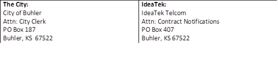 This Contract Franchise (“Franchise or Agreement”) is entered into as of January 26, 2016 (“Effective Date”) by and between the City of Buhler, a municipal corporation (the “City”), and IdeaTek Telecom LLC (“IdeaTek”).